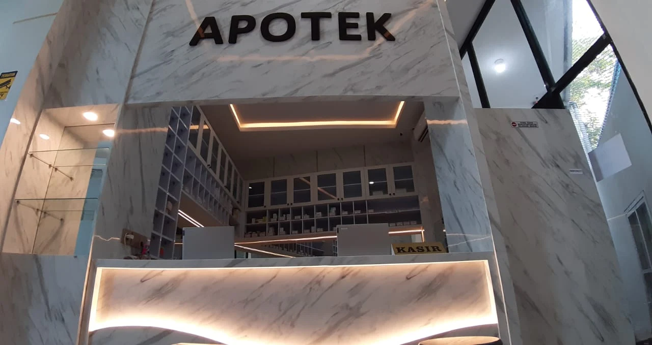Sediaan farmasi lengkap dengan konsultasi apoteker di area berdesain marmer eksklusif.